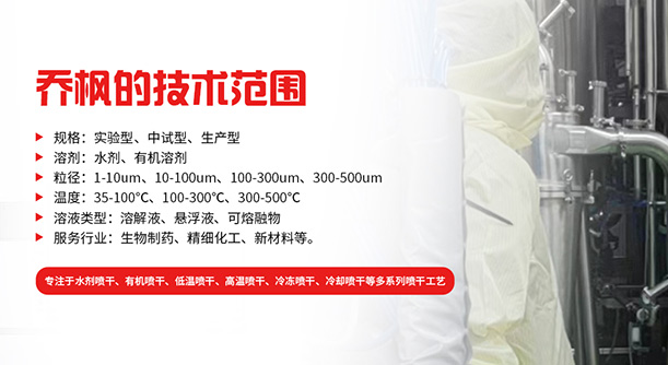 上海喬楓實業有限公司,成立于2012年,是從事噴霧干燥設備的研發設計、生產、銷售(小型噴霧干燥機,實驗型噴霧干燥機,35℃低溫噴霧干燥機,有機溶劑噴霧干燥機低溫閉式循環噴霧干燥機、超細粉末噴霧干燥機、噴霧冷凍干燥機、真空噴霧干燥機、氣流噴霧干燥機,噴霧造粒干燥機離心噴霧干燥機,沸騰制粒機等)和售后于一體的綜合性公司,本公司現成為一家致力于為生物制藥、精細化工、新能源、陶瓷造粒及食品工程等領域提供全套解決方案的整線交鑰匙工程企業。